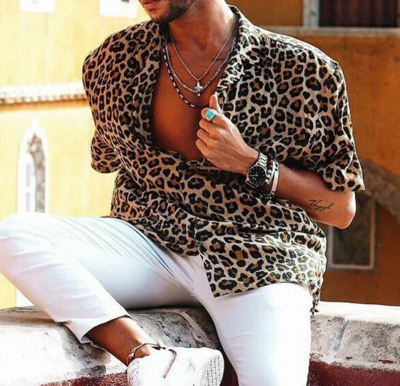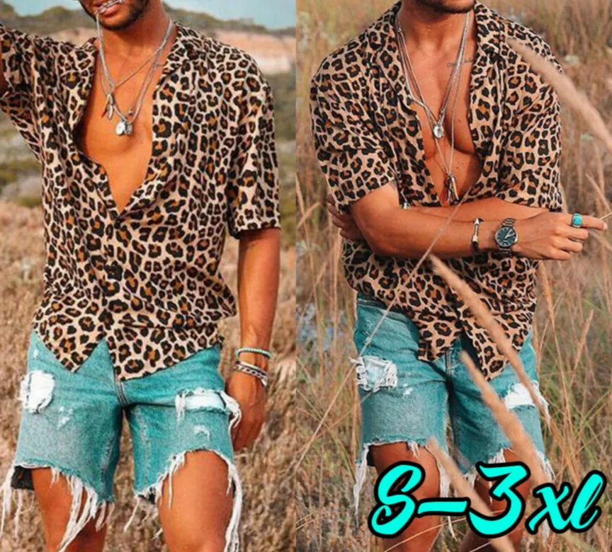 awesome New Fashion Men's Short Sleeve Leopard Print Shirts Male Loose Sexy Summer Casual Turn Down Neck Bl