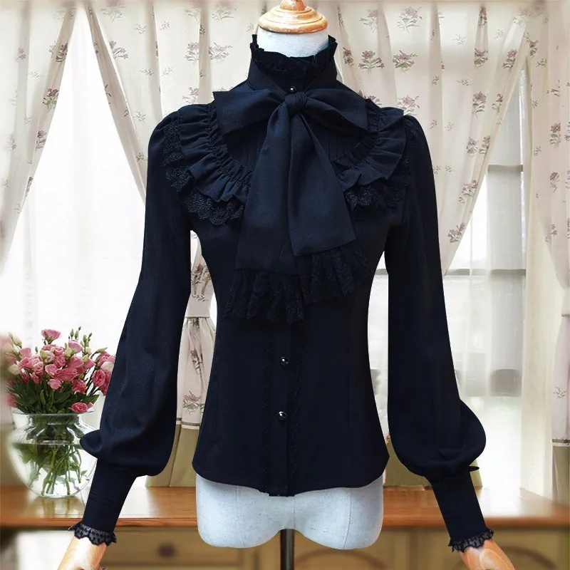 Finest PYJTRL Vintage LOLITA Wine Red Black Blue White Long Sleeve Chiffon Shirt Women Stand Collar Elegan
