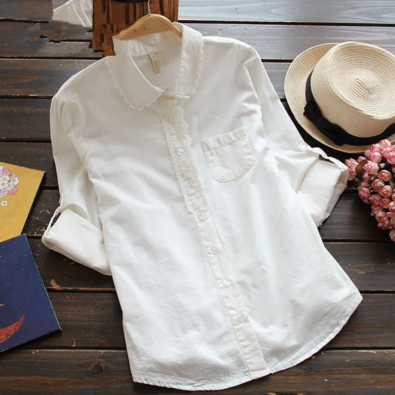 Promo White Blouse Button Up Lace Crochet Turn Down Collar Long Sleeve Cotton Top Shirt with Pocket Size