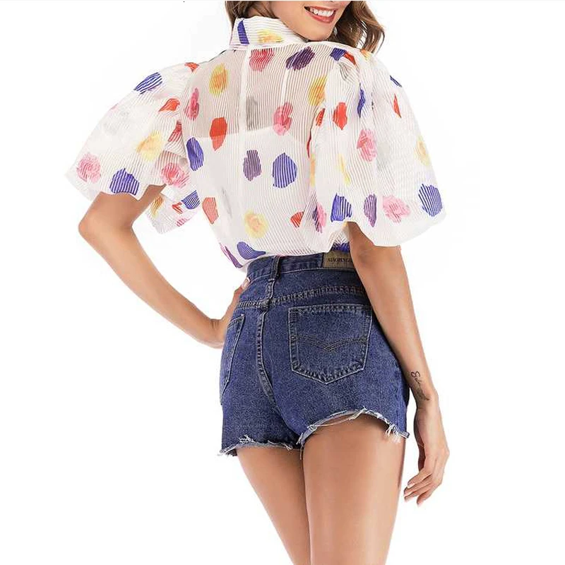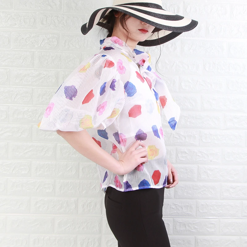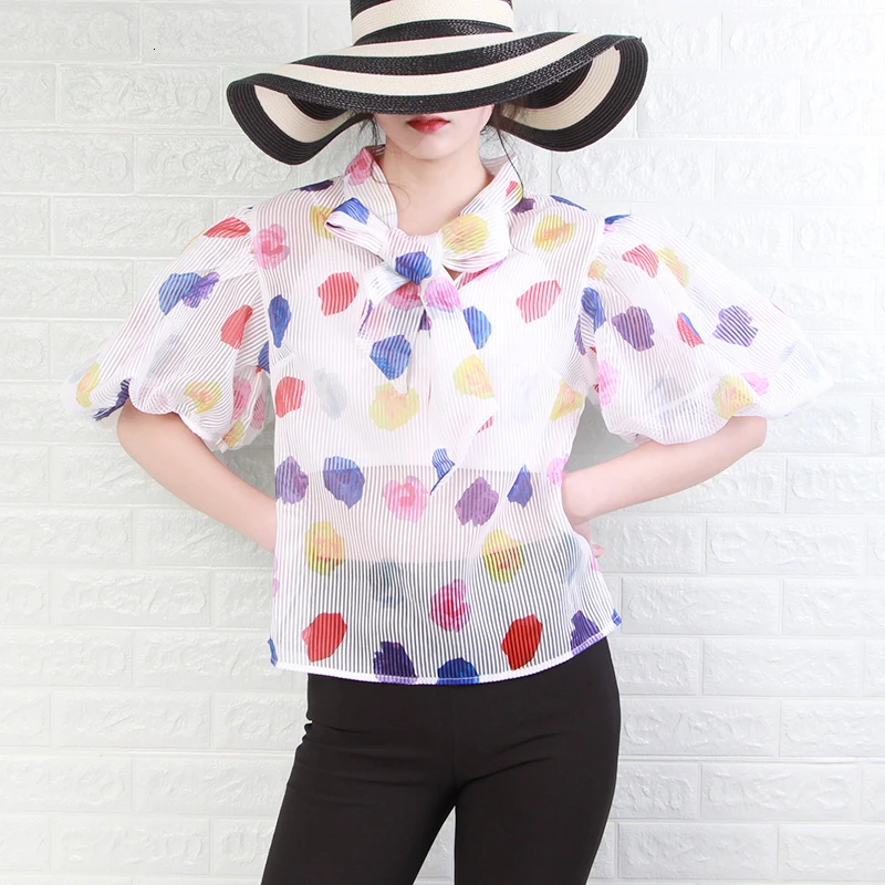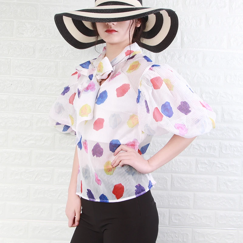 low cost TWOTWINSTYLE Print Polka Dot Shirts Blouse Women Bowknot Lantern Short Sleeve Hit Color Large Size