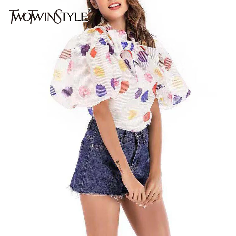 astounding TWOTWINSTYLE Print Polka Dot Shirts Blouse Women Bowknot Lantern Short Sleeve Hit Color Large Size
