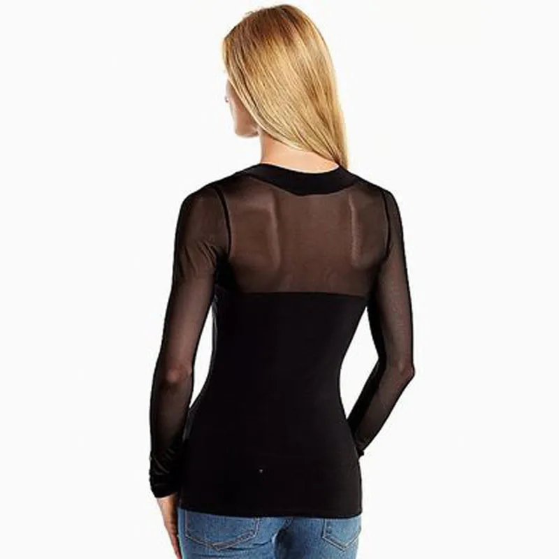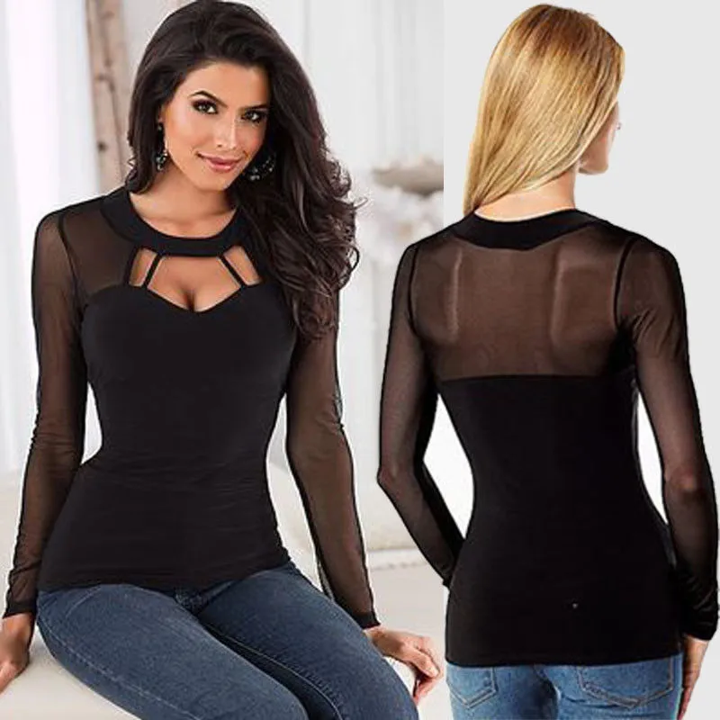 Best Women Sexy Mesh Blouses 2017 Blusas Femininas Long Sleeve O Neck Casual Black Slim See Through Shir