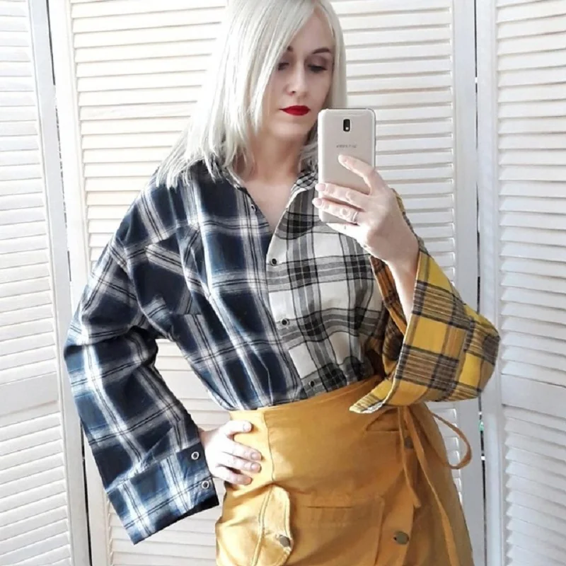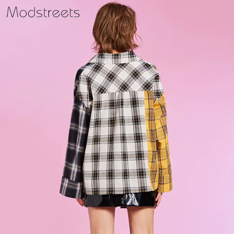 discounted Women Shirt Oversize Cotton Plaid Blouse Casual Korea Splice Top Motorcycle Hip Hop Streetwear Patc