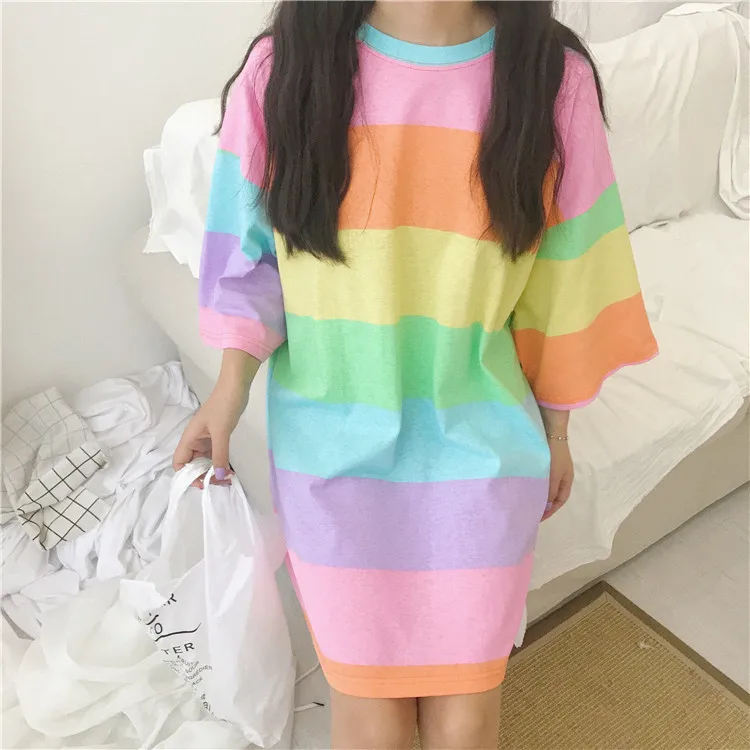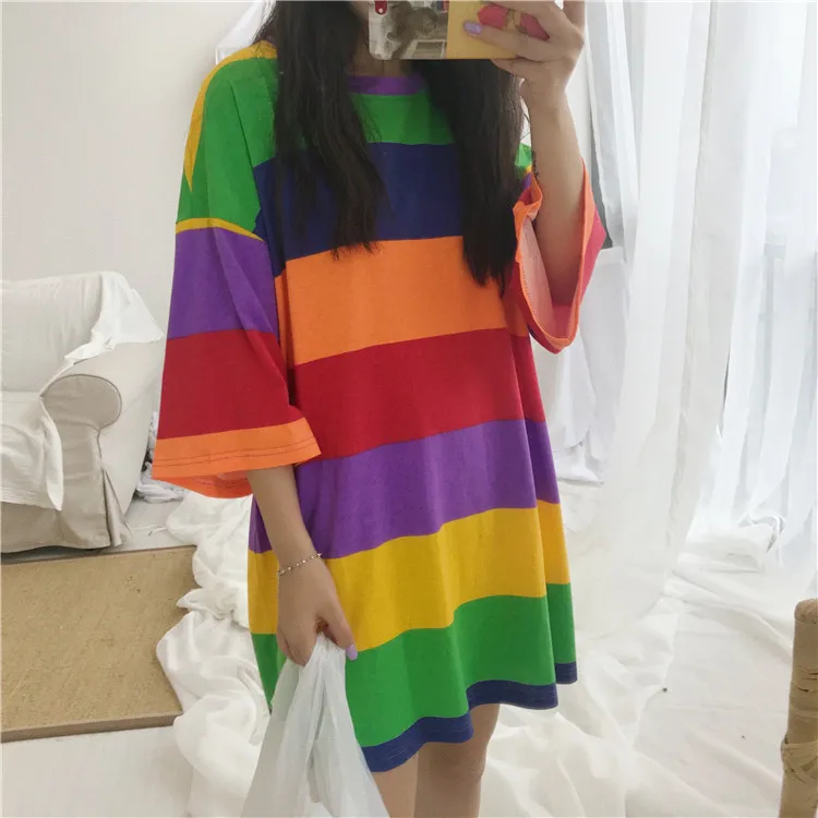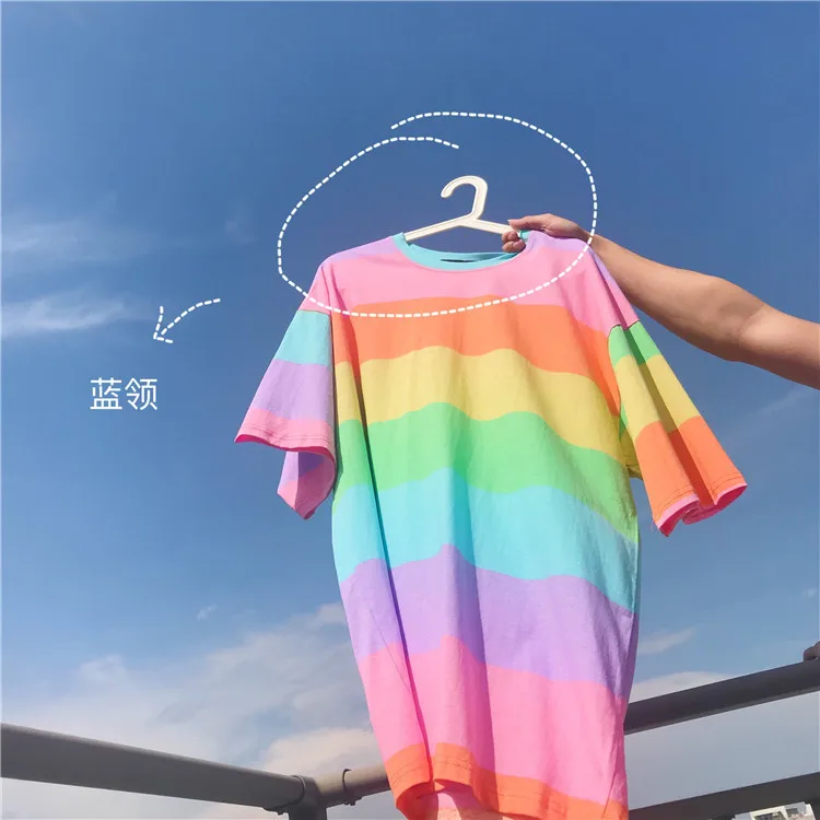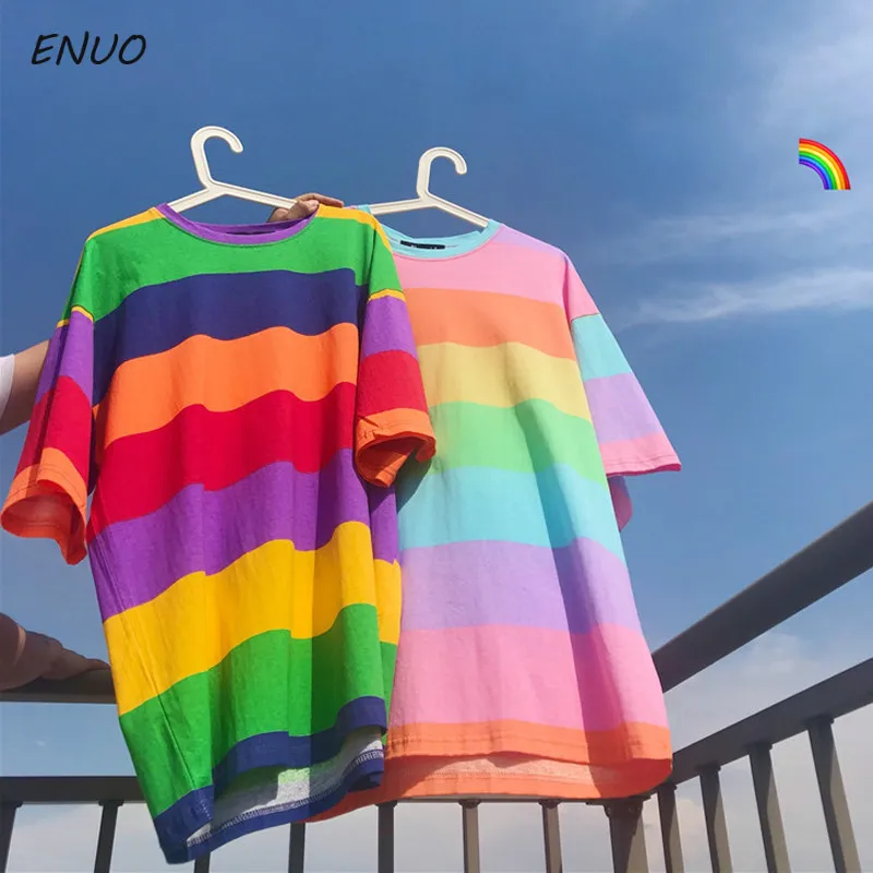 discounted New T Shirt Women Rainbow Striped Tops Harajuku Tshirt 2019 Summer Short Sleeve Korean Punk T-shirt