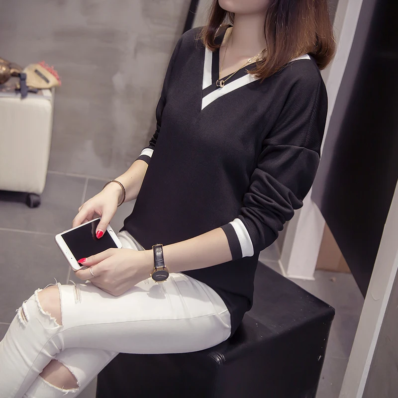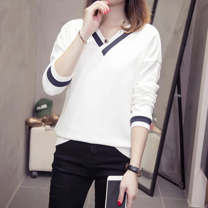 wonderful Plus Size V Neck Thick T-shirts Women Korean Spliced Tops 2019 Autumn Long Sleeve T shirt Oversized